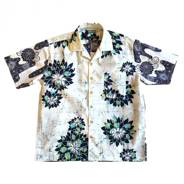 青色の薔薇と椿とロウケツ染の浴衣地アロハシャツ【LL】