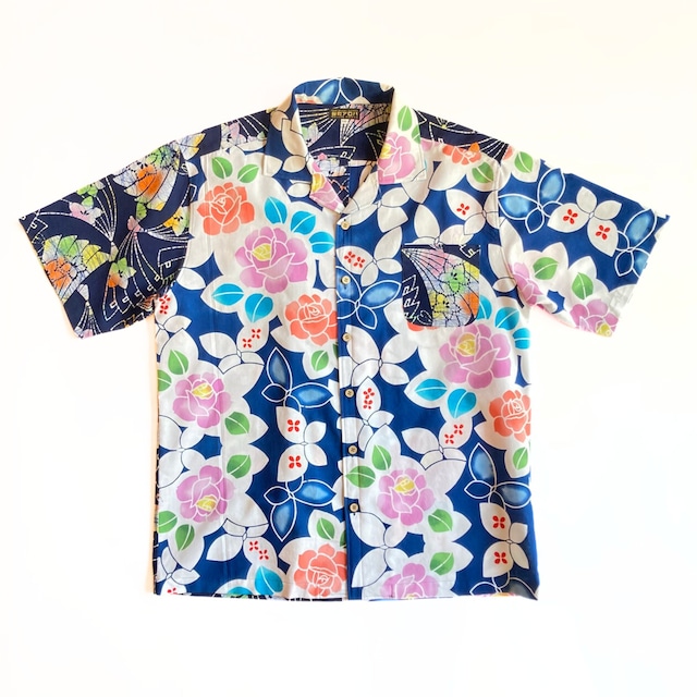 紺地に芙蓉と桔梗の浴衣地アロハシャツ【L】