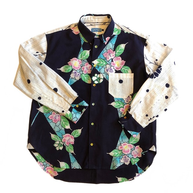ピンクの花の浴衣地長袖シャツです。 紺地にピンクと藤色の花と水色三角形の浴衣地と白地に紺色の板締め絞りと桜の環と縦の茎柄がかわいい浴衣地を組み合わせました。 ポケットやカフス・カラフルボタンや裾のラウンドなど細部にこだわって作りました。 ※通常のLサイズより少し大きめです。 ■素材:綿100% ■サイズ:L 着丈 S71 M74 L75 LL75 胴囲 S108 M112 L116 LL120 肩幅 S44 M46 L48 LL51 袖丈 S24 M25 L26 LL26.5 ■取り扱い注意事項 織り方、染め方などによって縮んだり、色落ちする場合がございます。 また、古着物を使用しているため、生地にシミやキズがある場合がございますので、あらかじめご了承くださいませ。 製品を長くご愛用いただくためにも、洗濯はドライクリーニングをご利用ください。 ■お手入れ方法 着物生地から作ったアロハシャツの洗濯は、原則はドライクリーニングでお願いします。 どうしても自分で洗いたいと思われる方は下記の点などに注意してください。 なお、ご自宅で洗濯された場合の責任は当方では負いかねます。 【着物地アロハ】 ・できるだけ水だけでやさしく手洗いしてください。 ・できるだけ単独で行ってください。(色落ちする生地が多いため) ・洗剤を使う場合、中性洗剤を必ず使用してください。 ・漂白剤配合洗剤は絶対に使用しないでください。 ・よくすすぎ、タオルドライして日陰でつり干しにしてください。 ・強く絞らないでください。 ・水にぬらすと縮むものがあります。 (縮んだ際、半渇きの状態で優しく引っ張りながらアイロンをかけると、もとに戻るものもあります) ・アイロンはあて布をして、低い温度(100度前後)でかけてください。 【浴衣地アロハ】 ・最初は単独で洗ってください。(色落ちする生地が多いため) ・色落ちがなければ、他の物と一緒に洗濯機で洗ってください。 ■その他の情報や注意事項 ・画像は実物に近い色合いを再現しておりますが、モニターによって若干の色差が生じる場合があります 購入に関するご質問やご相談は、ショップの問い合わせページよりお気軽にお問い合わせください。