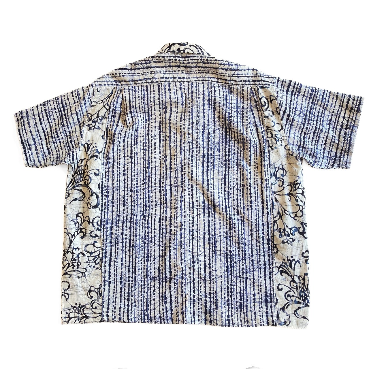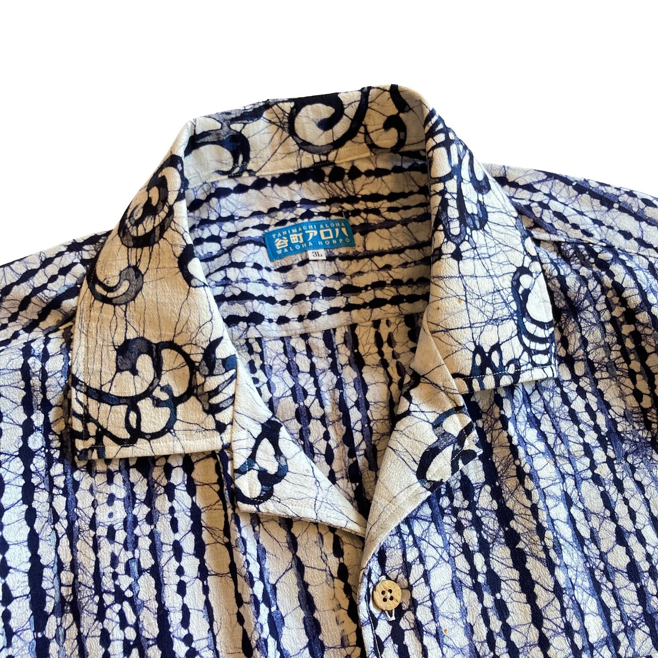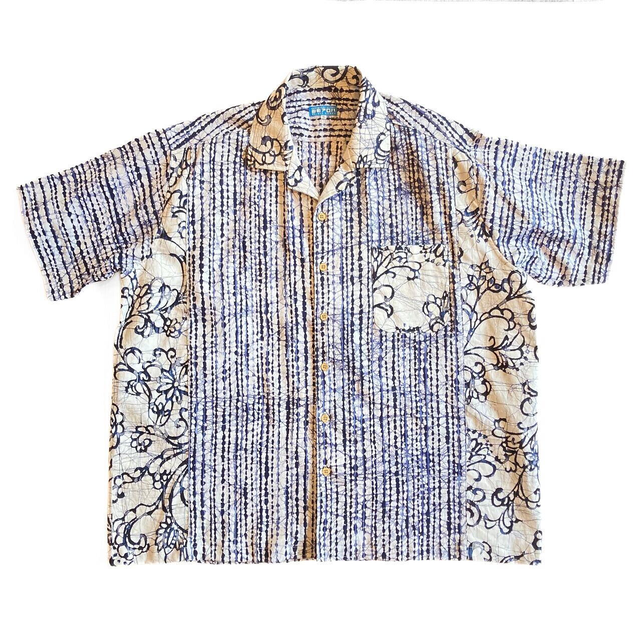 白地に藍色ロウケツ染浴衣地アロハシャツ【3L】