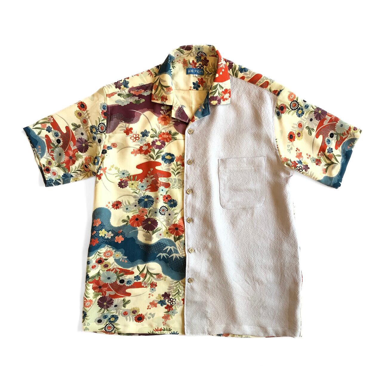 淡い藤色とアイボリーの花の正絹アロハシャツです。
