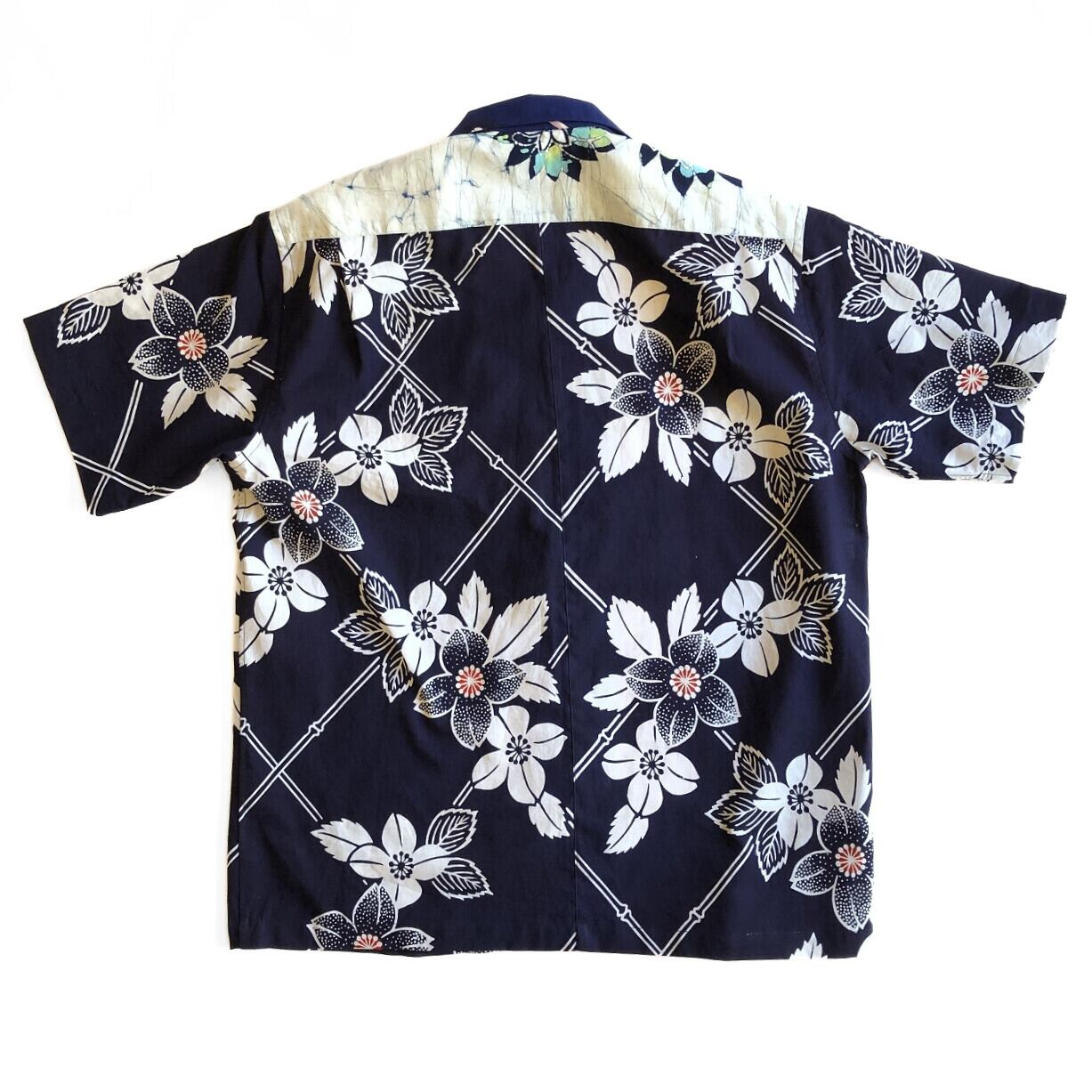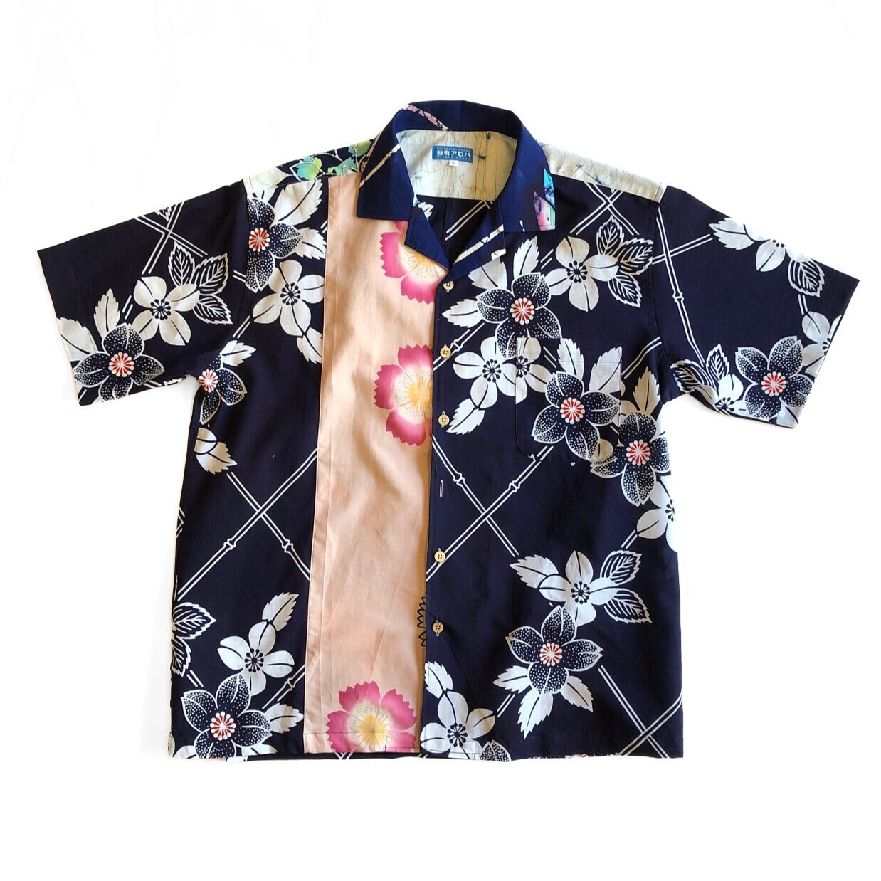 紺と淡いピンクの浴衣地アロハシャツ【L】