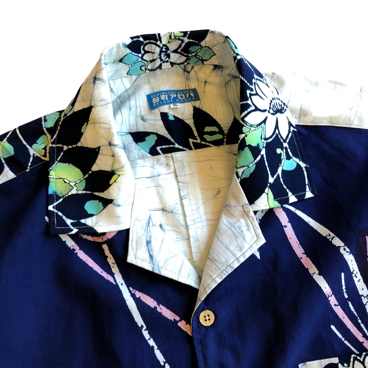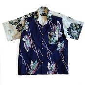 青の蝶とターコイズブルーの花の浴衣地アロハシャツです。