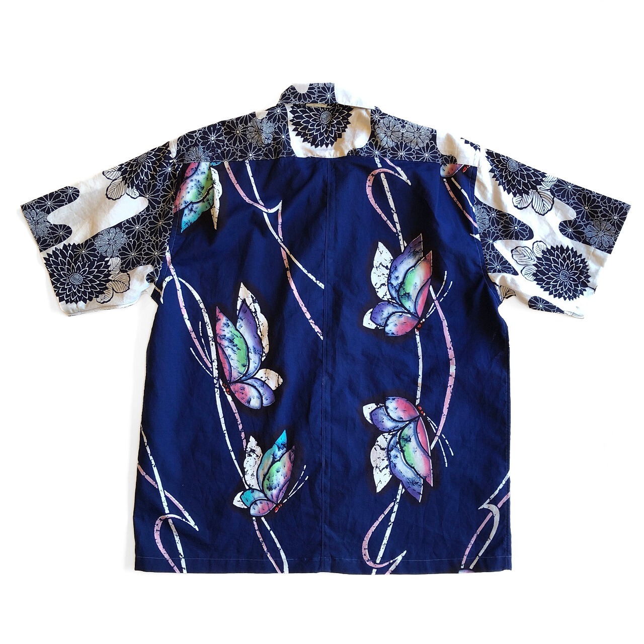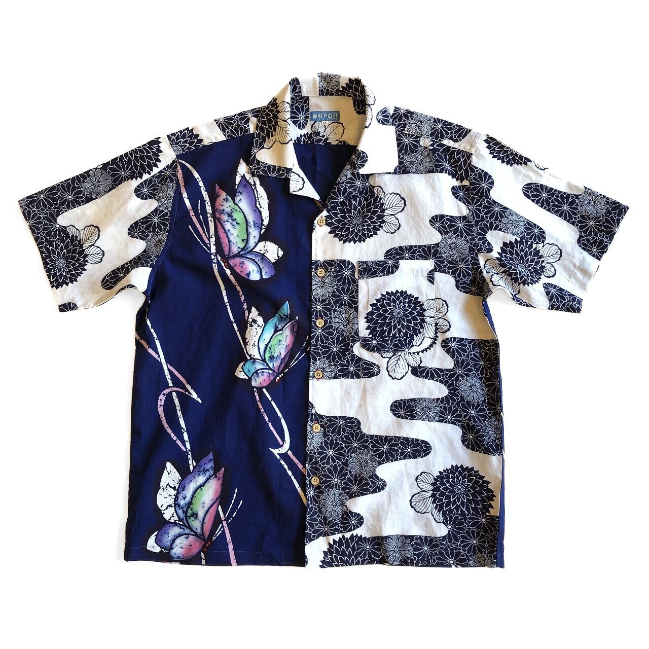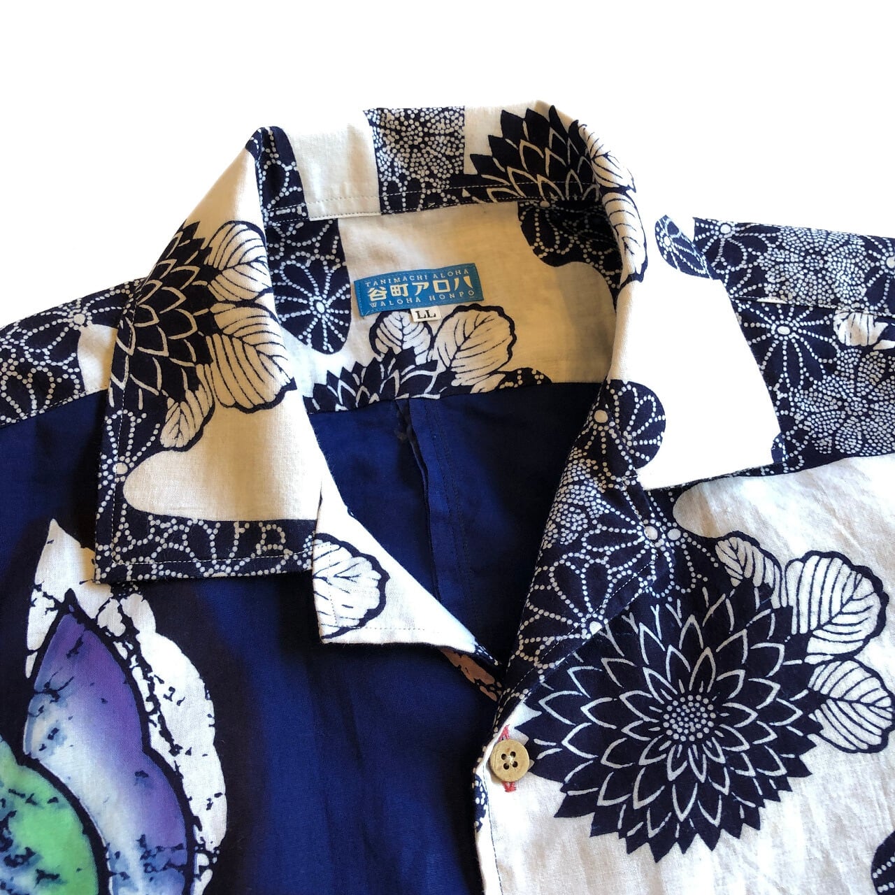 白と青のロウケツ染浴衣地アロハシャツ【LL】