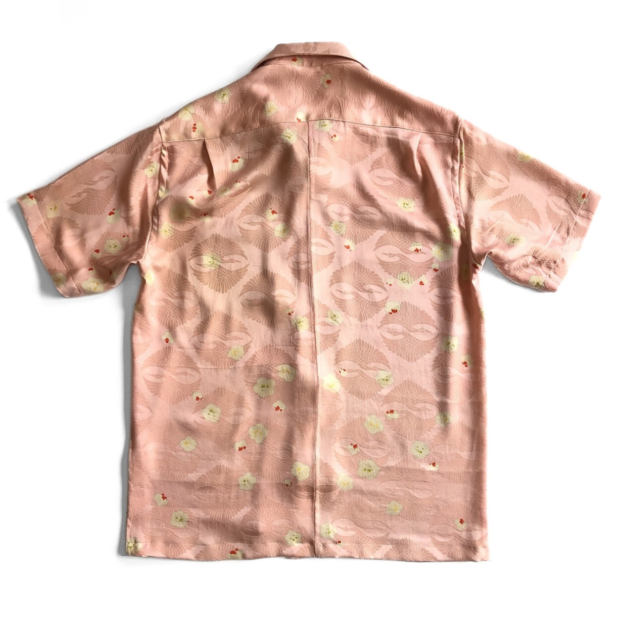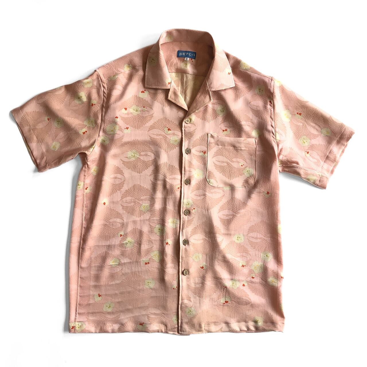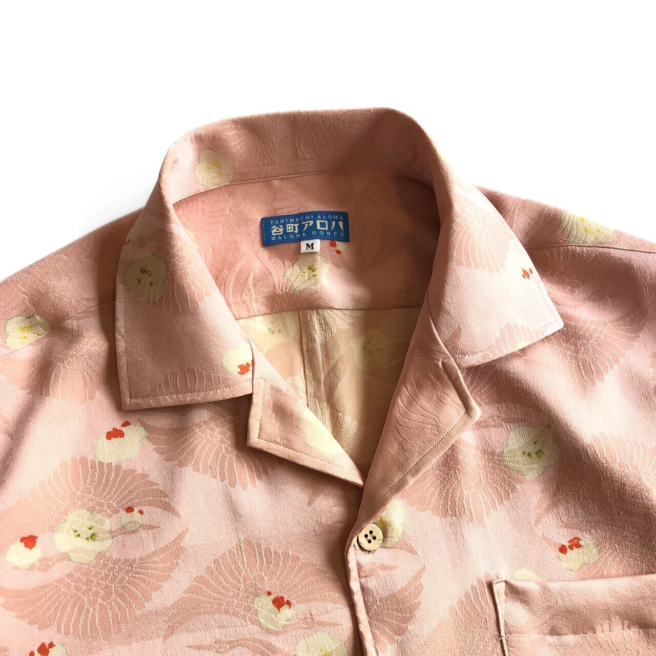 ピンクの鶴と梅花の正絹アロハシャツ【M】