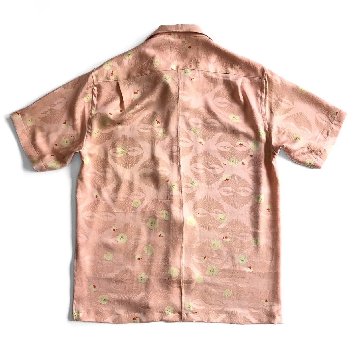 ピンクの鶴と梅花の正絹アロハシャツです。