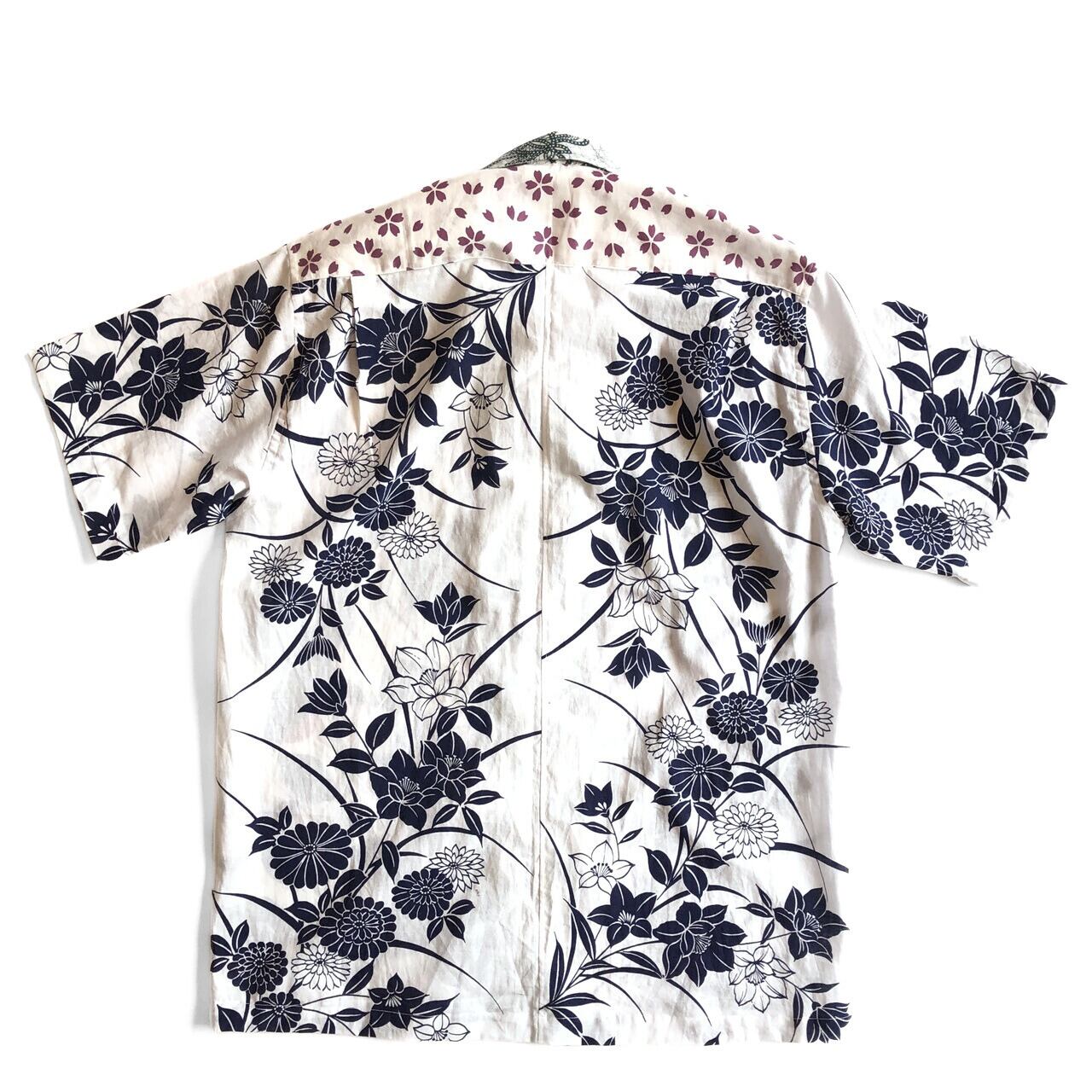 白地に紺色花と葉の浴衣地アロハシャツです。