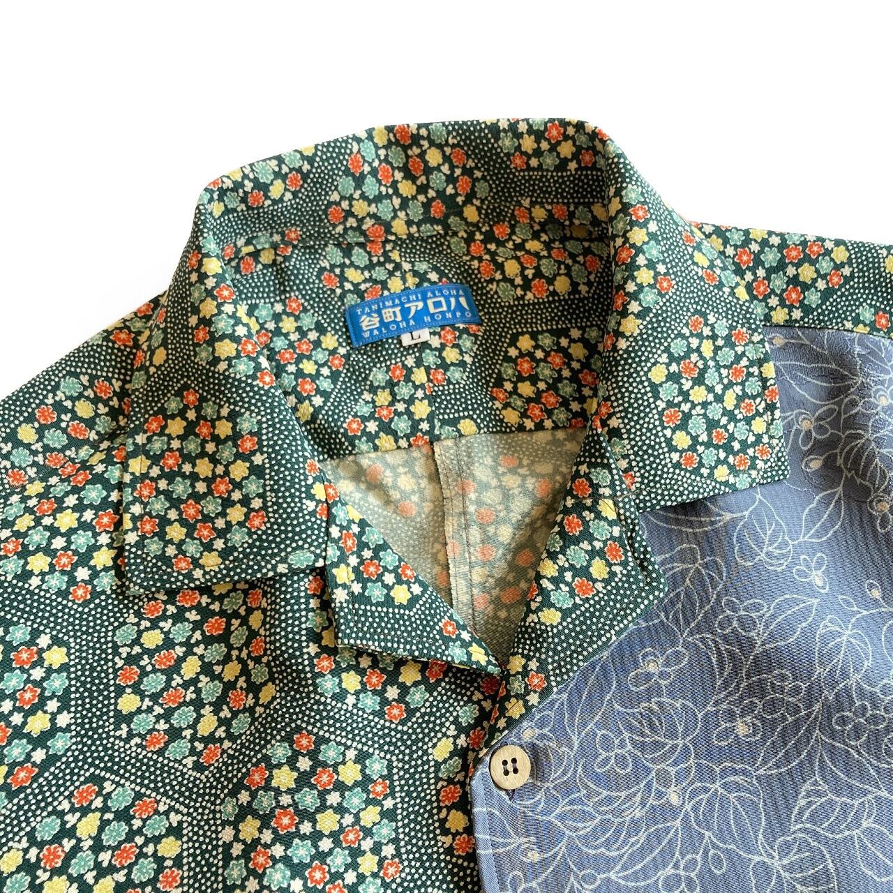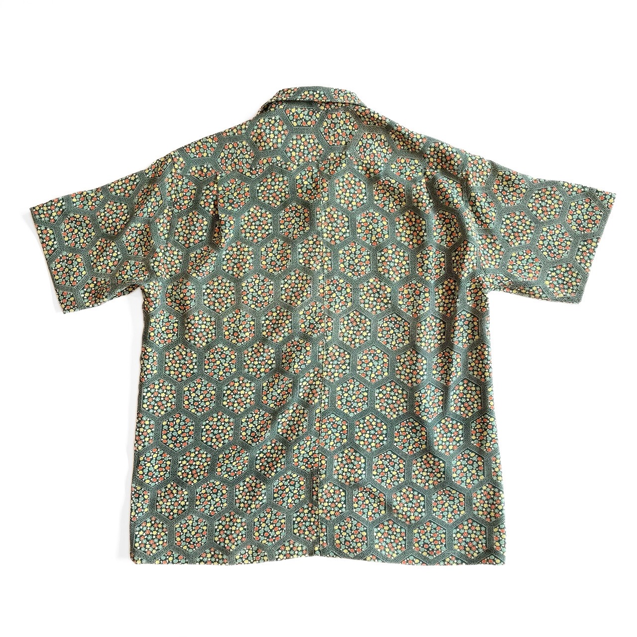 ブルーグレーと緑の亀甲正絹アロハシャツ【L】