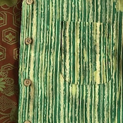緑と黄緑・クリーム色の不規則なストライプの小紋と緑地にオレンジの梅・笹・鳥・六角形の型染小紋を組み合わせました。