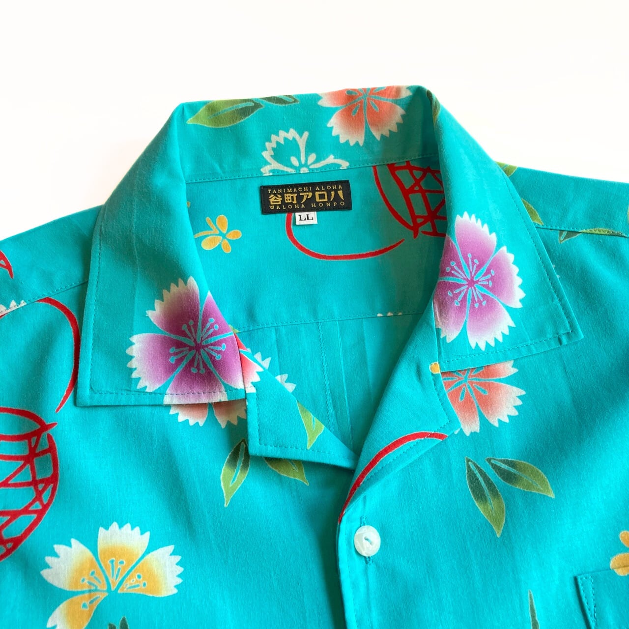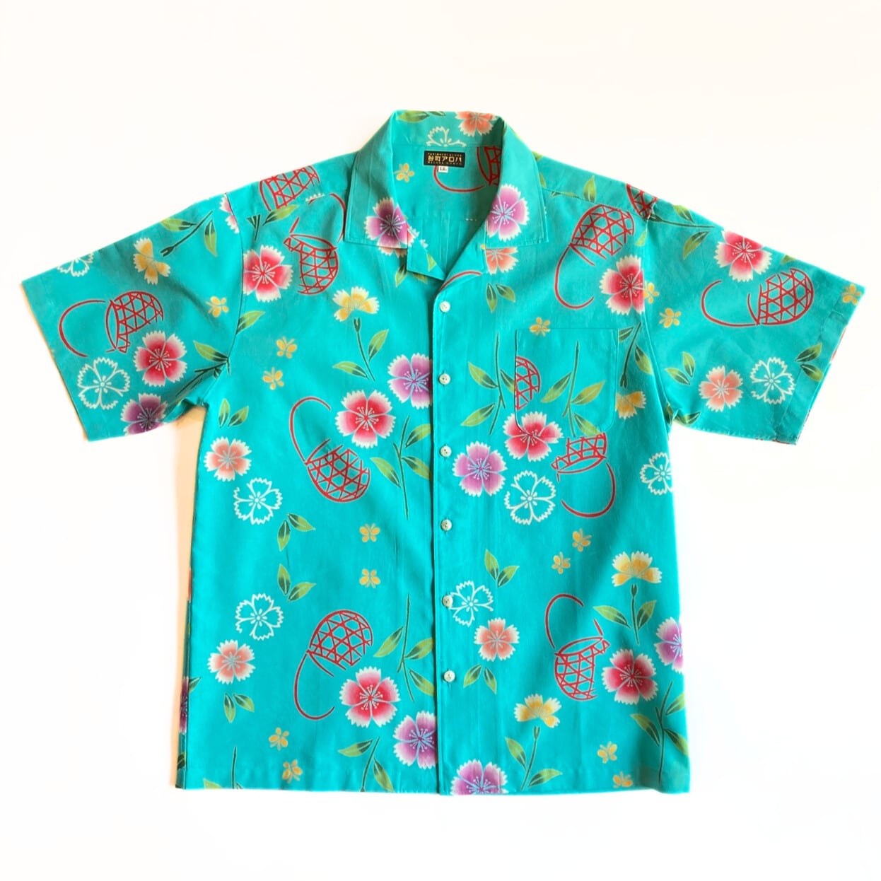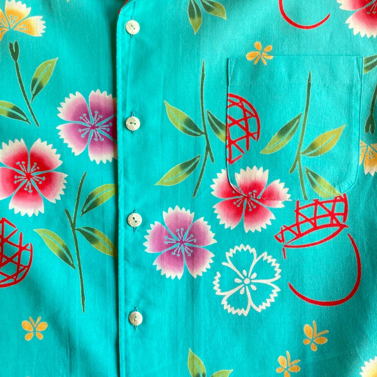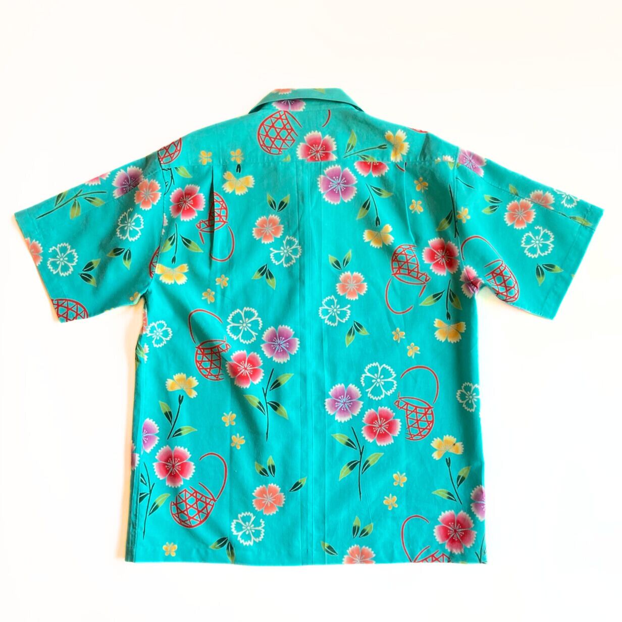 ターコイズブルーに撫子の浴衣地アロハシャツです。