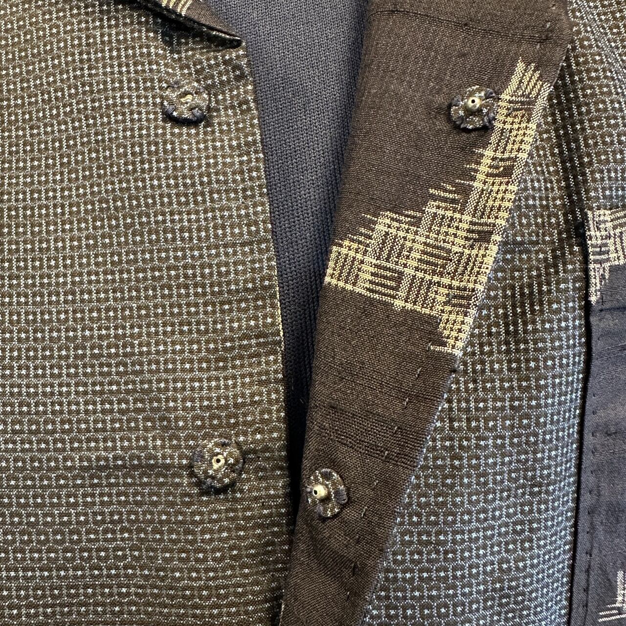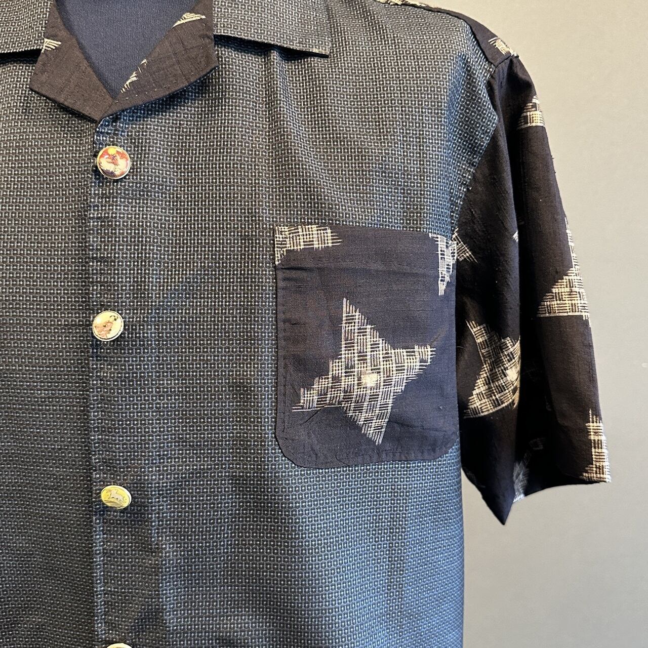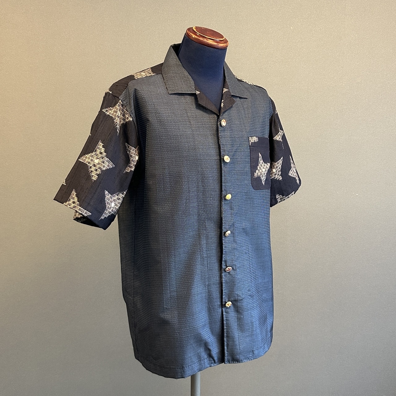 こちらのアロハに使われている着物は、2種類。紬、銘仙などの生地を切り返しで使っています。
