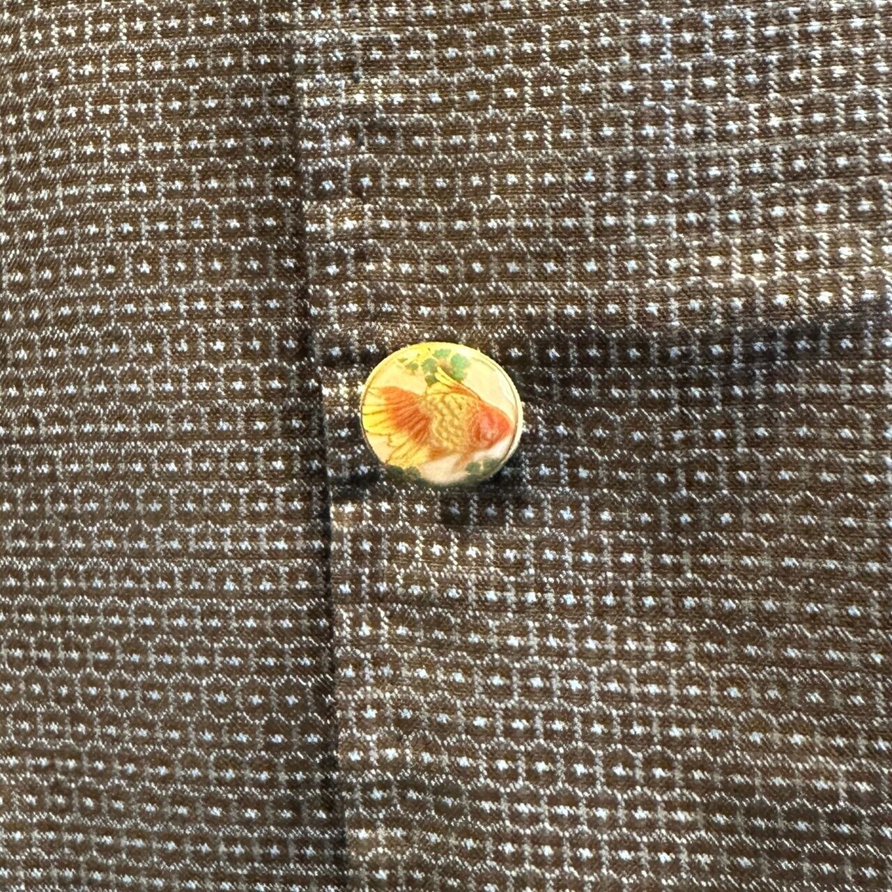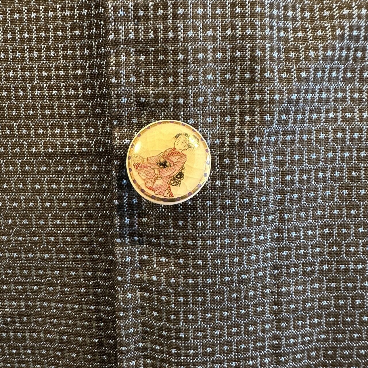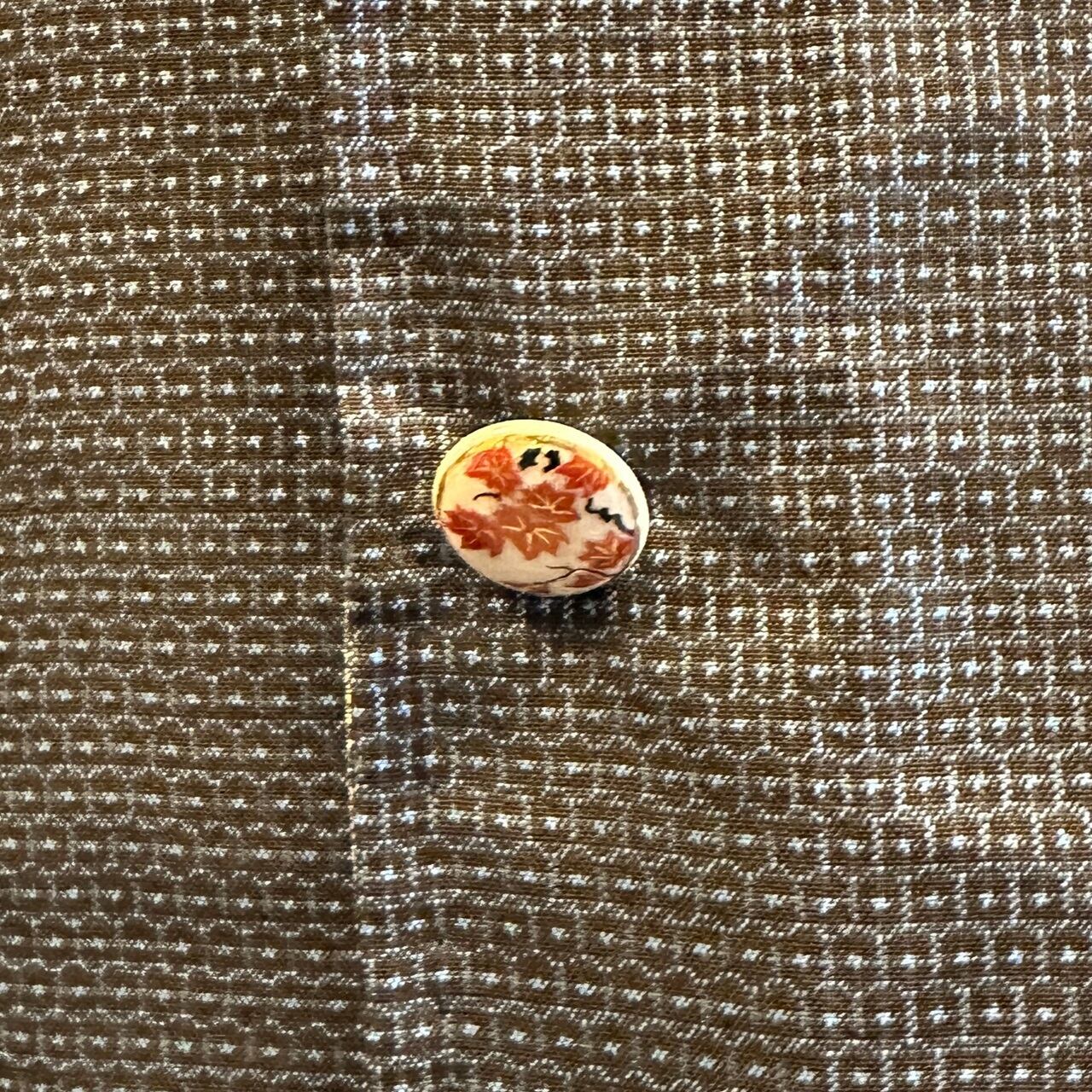 ボタンは、飾りボタンになっており、薩摩藩島津家に古くから伝わる伝統技法によって作られた陶器のボタンを使用しています。ボタン穴はあけずに、合わせる部分は、スナップボタンを一つ一つシャツと同じ素材の着物の布で包んであります。