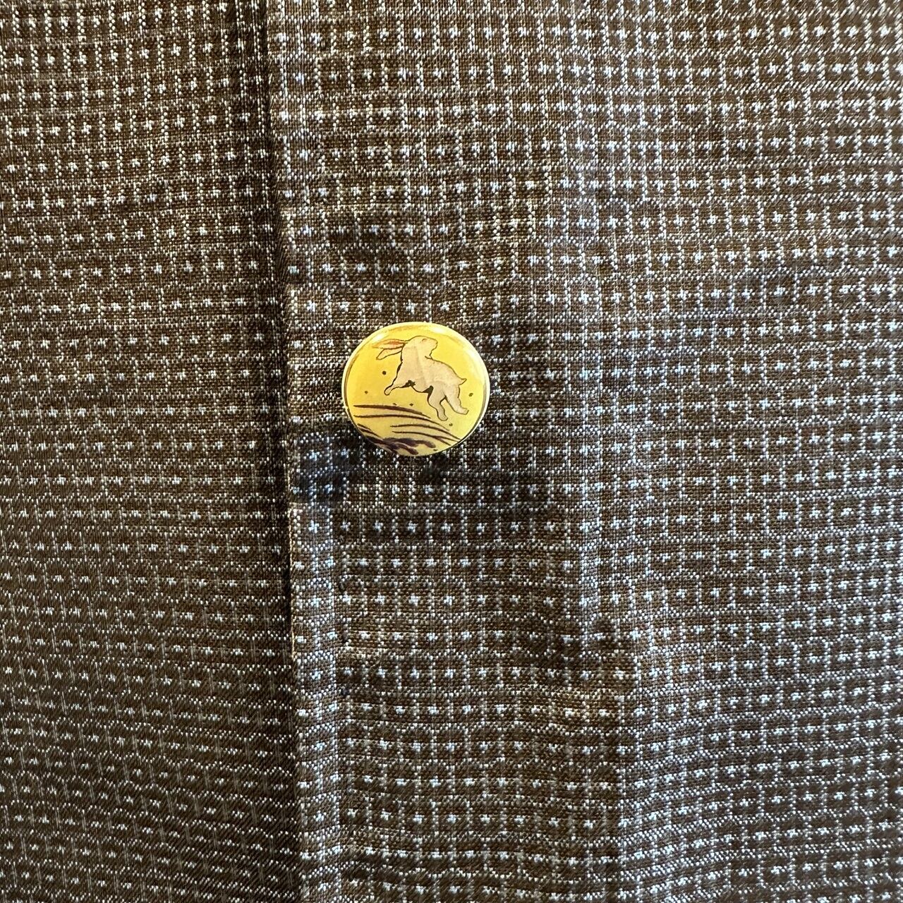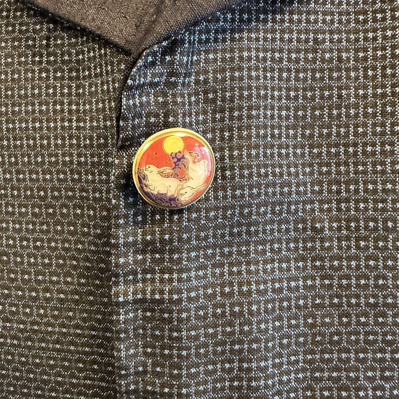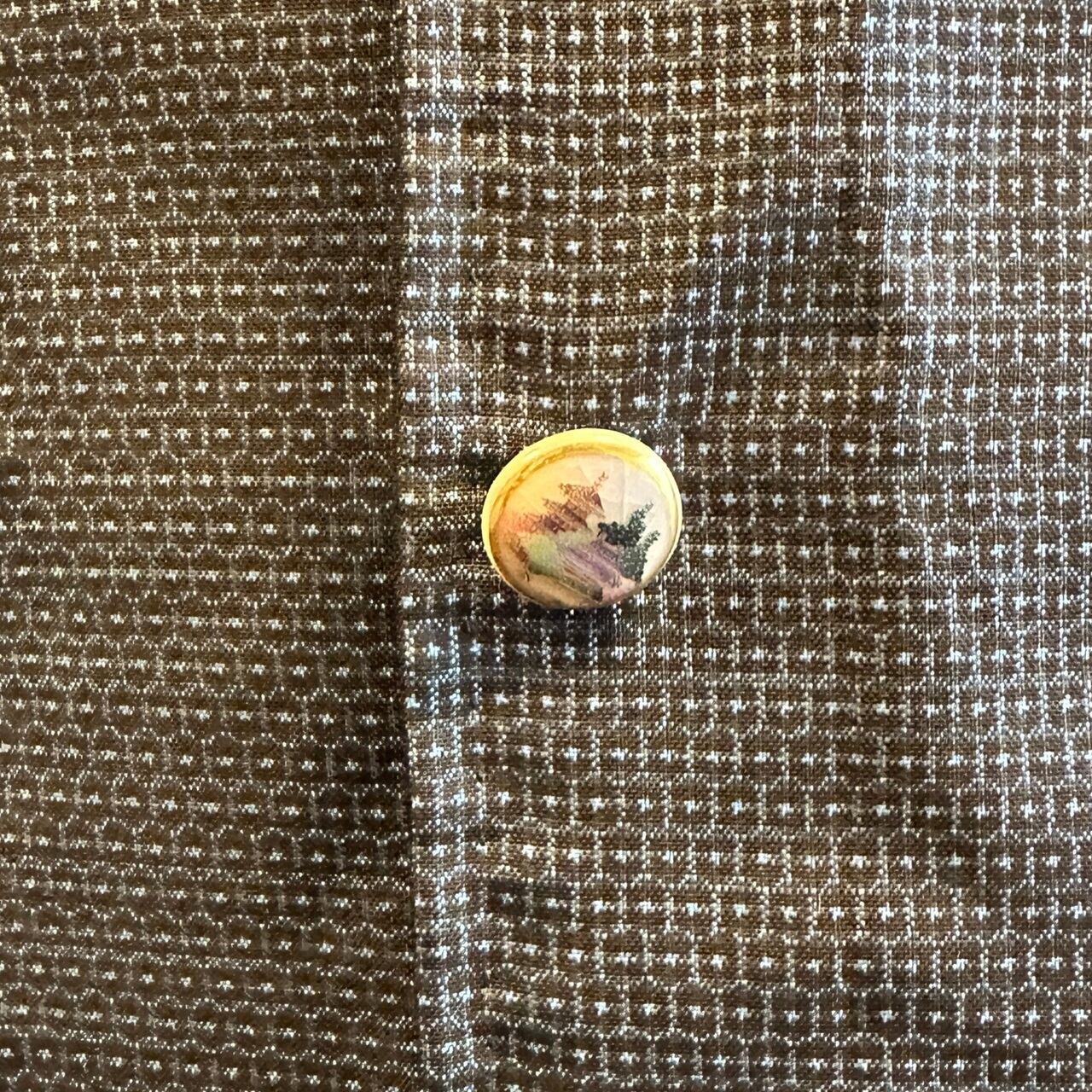 ボタンは、飾りボタンになっており、薩摩藩島津家に古くから伝わる伝統技法によって作られた陶器のボタンを使用しています。ボタン穴はあけずに、合わせる部分は、スナップボタンを一つ一つシャツと同じ素材の着物の布で包んであります。