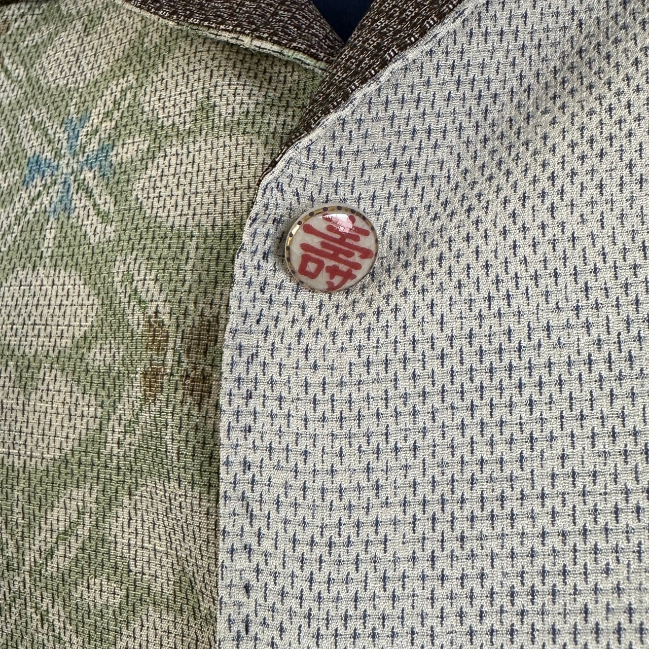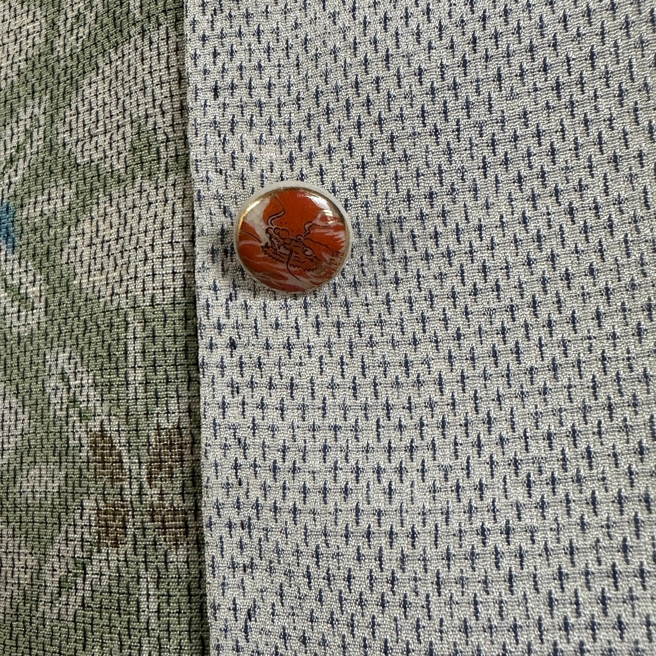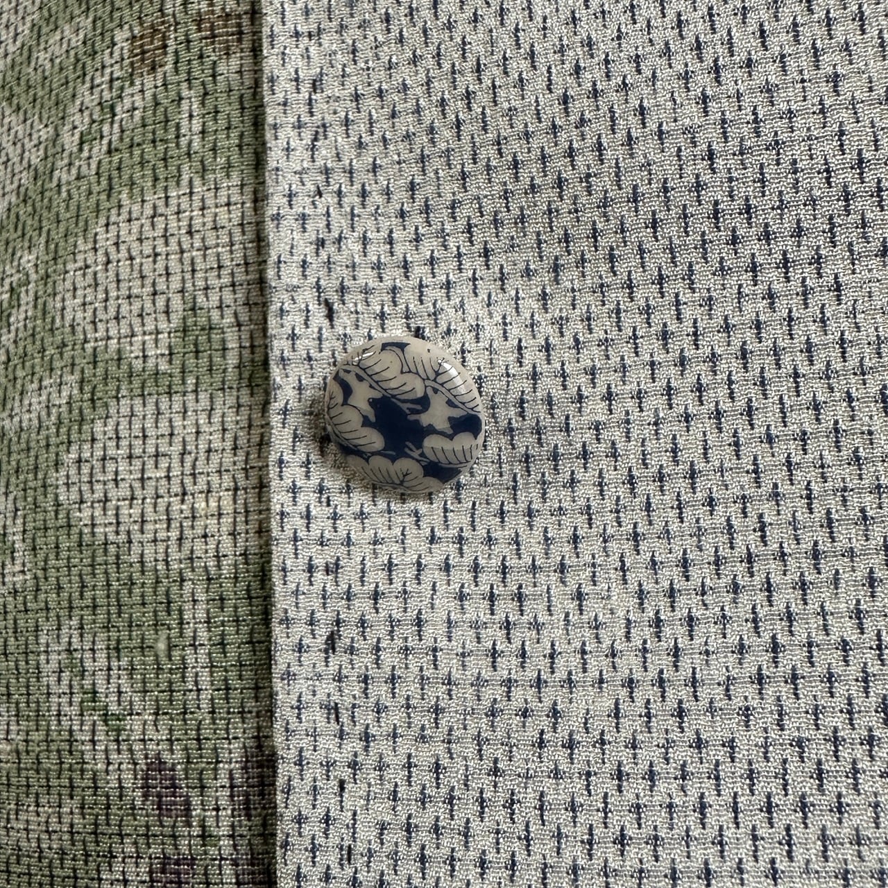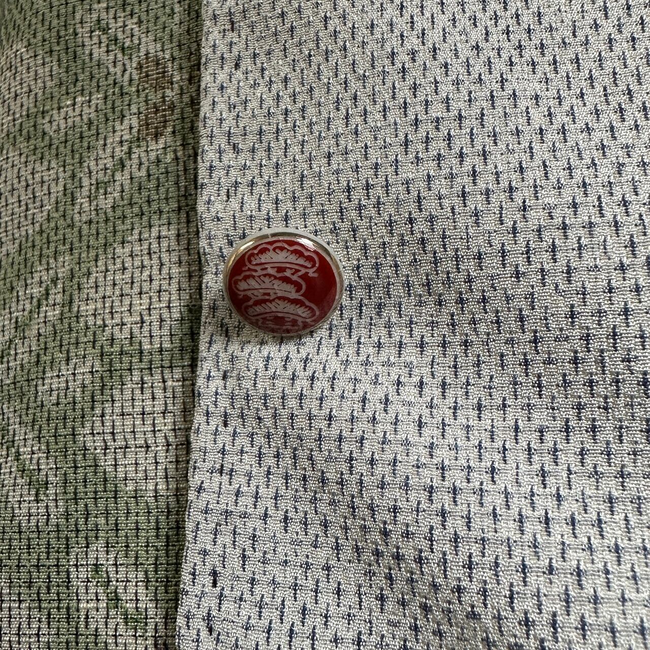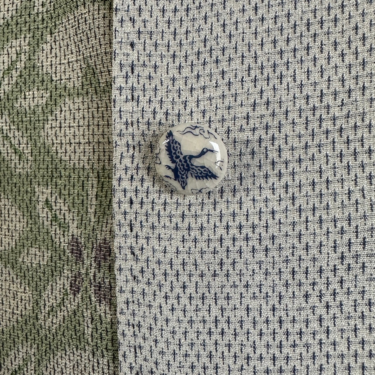 ボタンは、飾りボタンになっており、薩摩藩島津家に古くから伝わる伝統技法によって作られた陶器のボタンを使用しています。ボタン穴はあけずに、合わせる部分は、スナップボタンを一つ一つシャツと同じ素材の着物の布で包んであります。