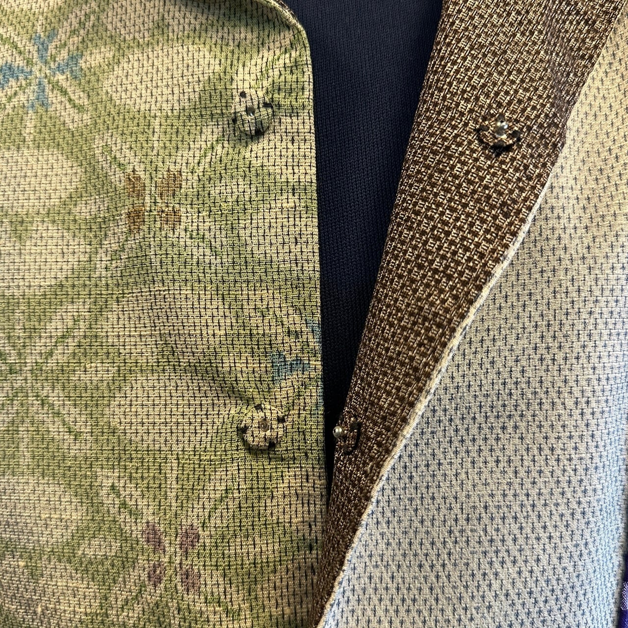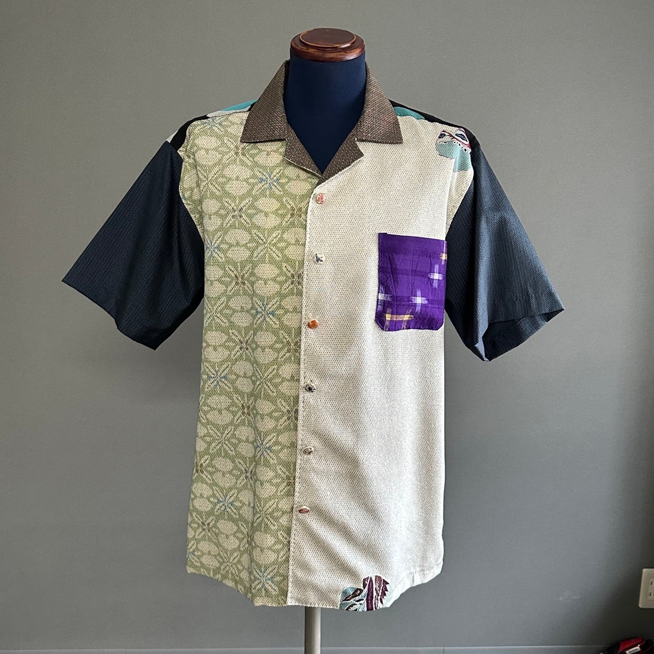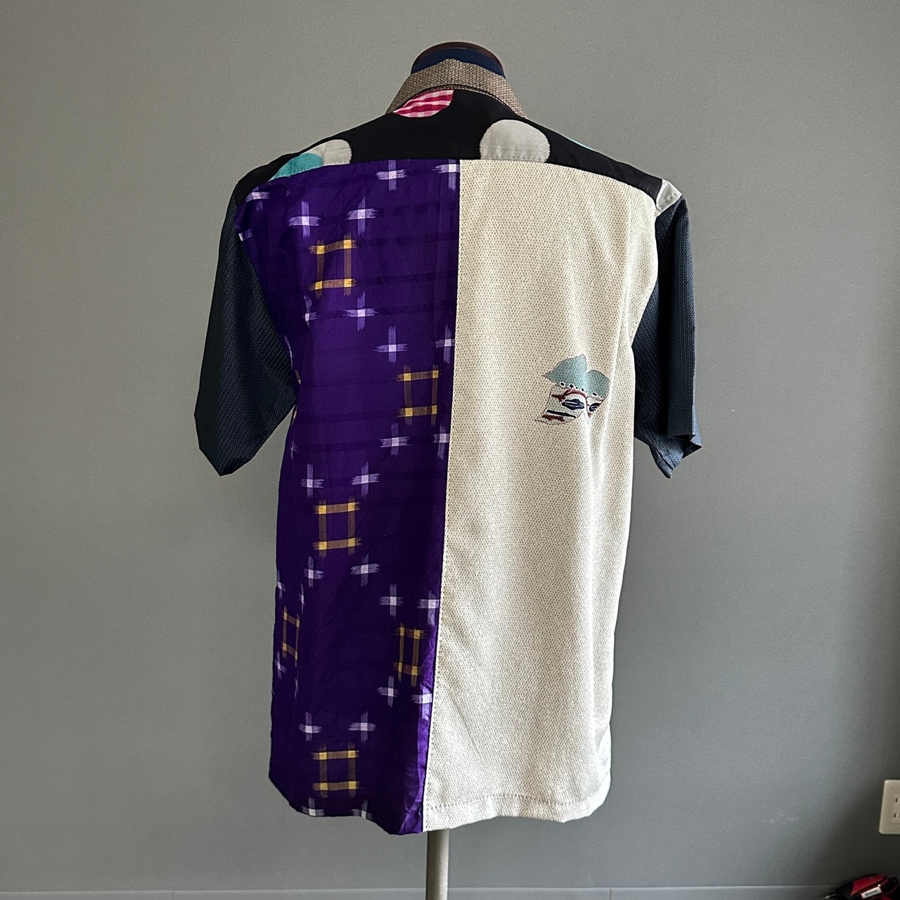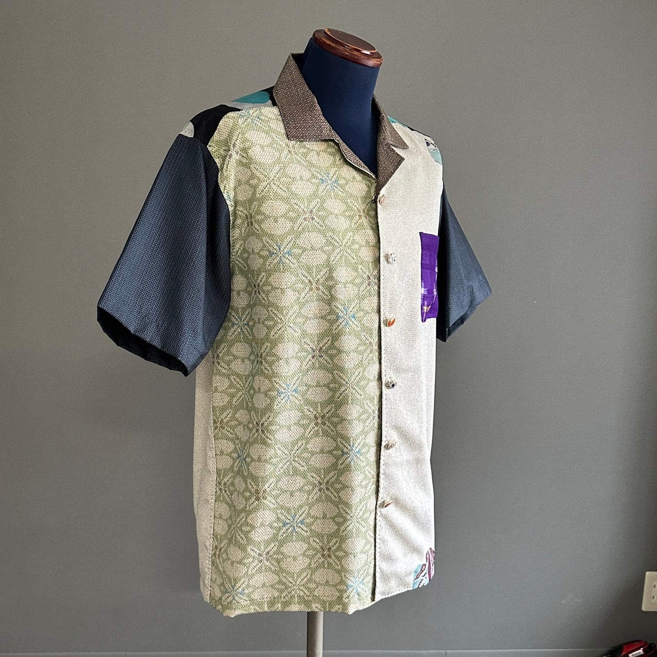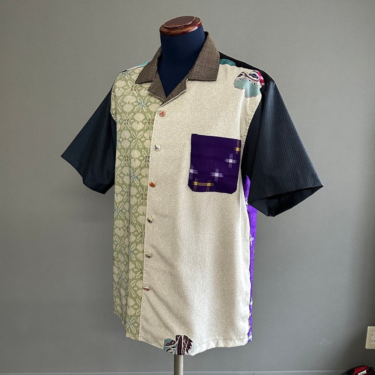 こちらのアロハに使われている着物は、5種類。大島紬、銘仙などの生地を切り返しで使っています。