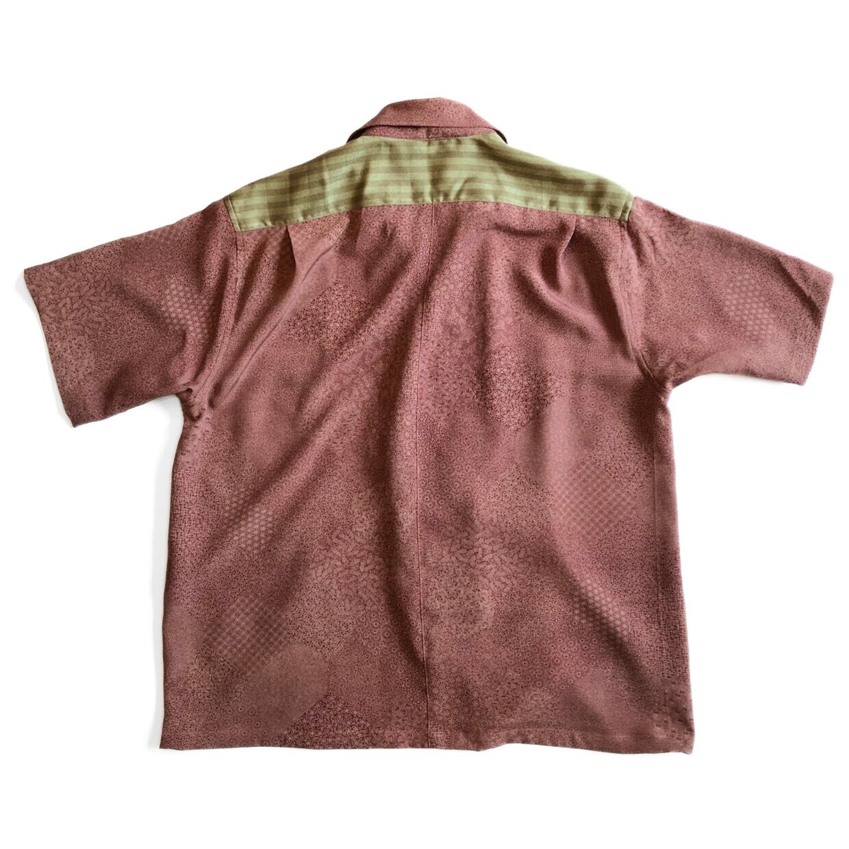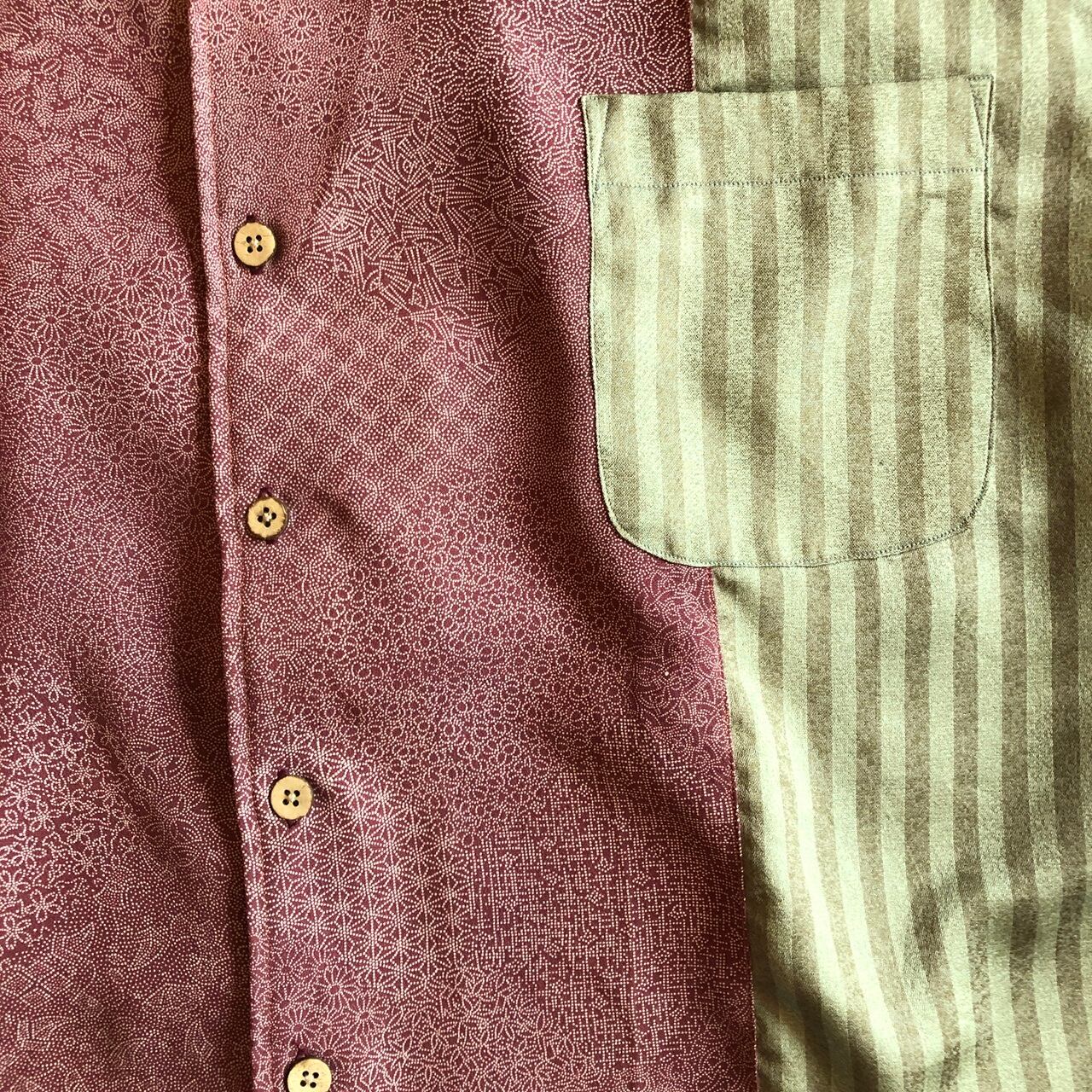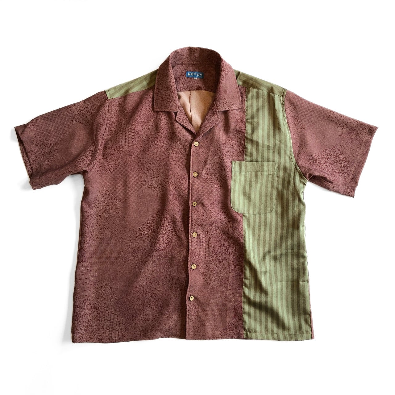 小豆色の江戸小紋と抹茶色ストライプの正絹アロハシャツです。