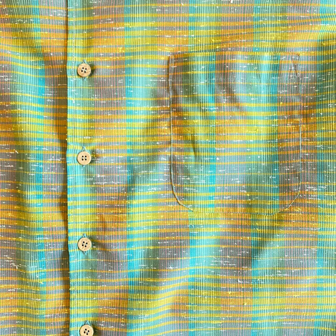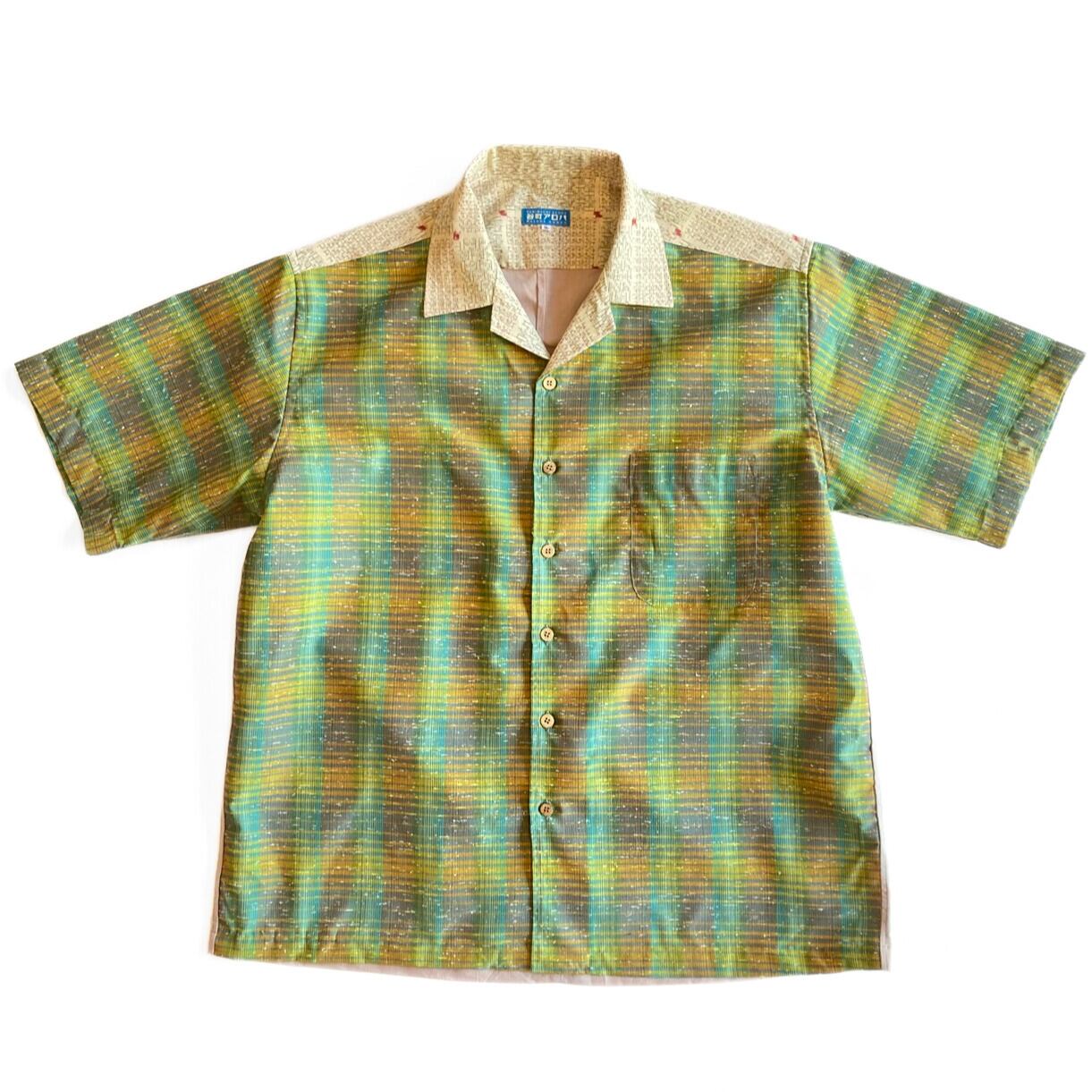 緑とオレンジの格子紬のアロハシャツです。