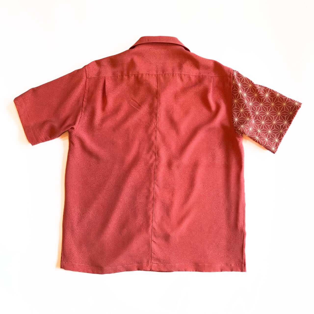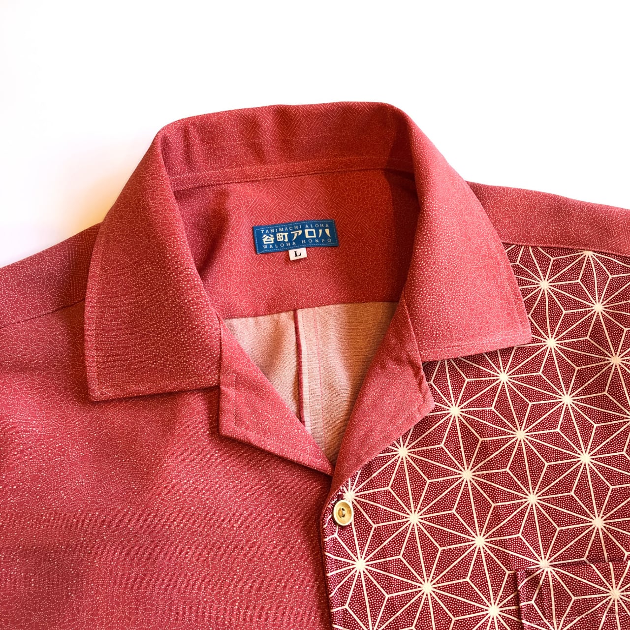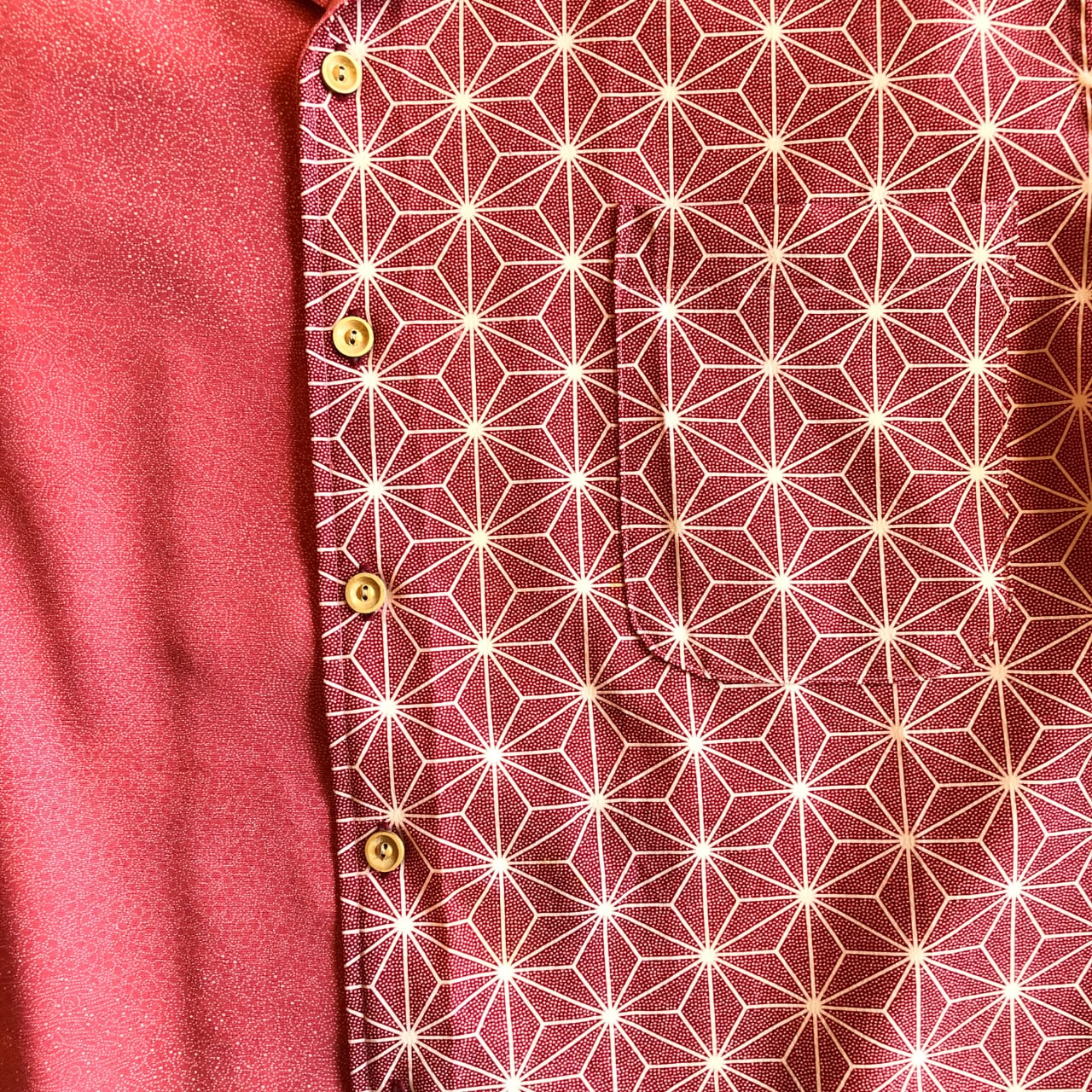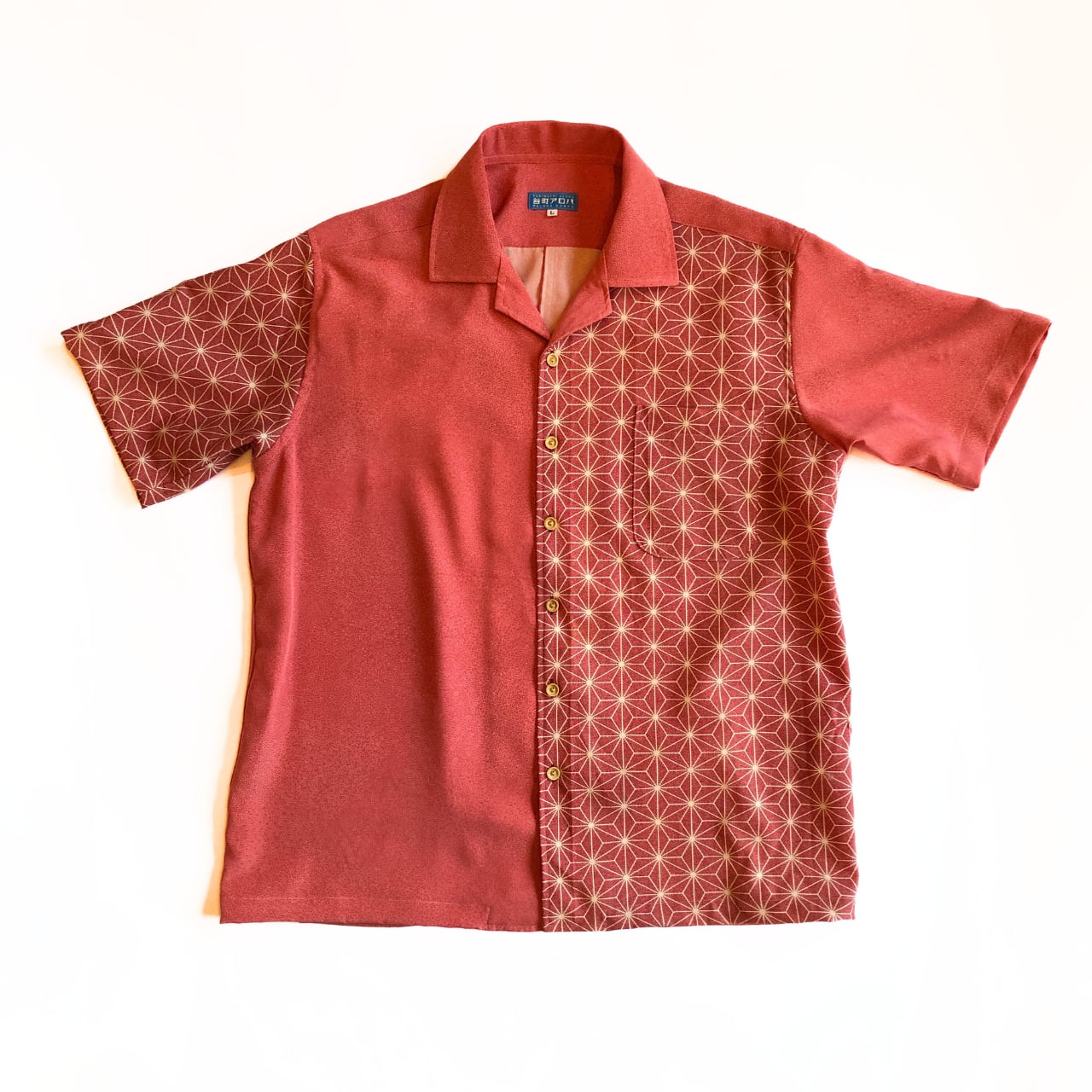 赤い麻の葉と寄せ小紋の還暦アロハシャツ【L】