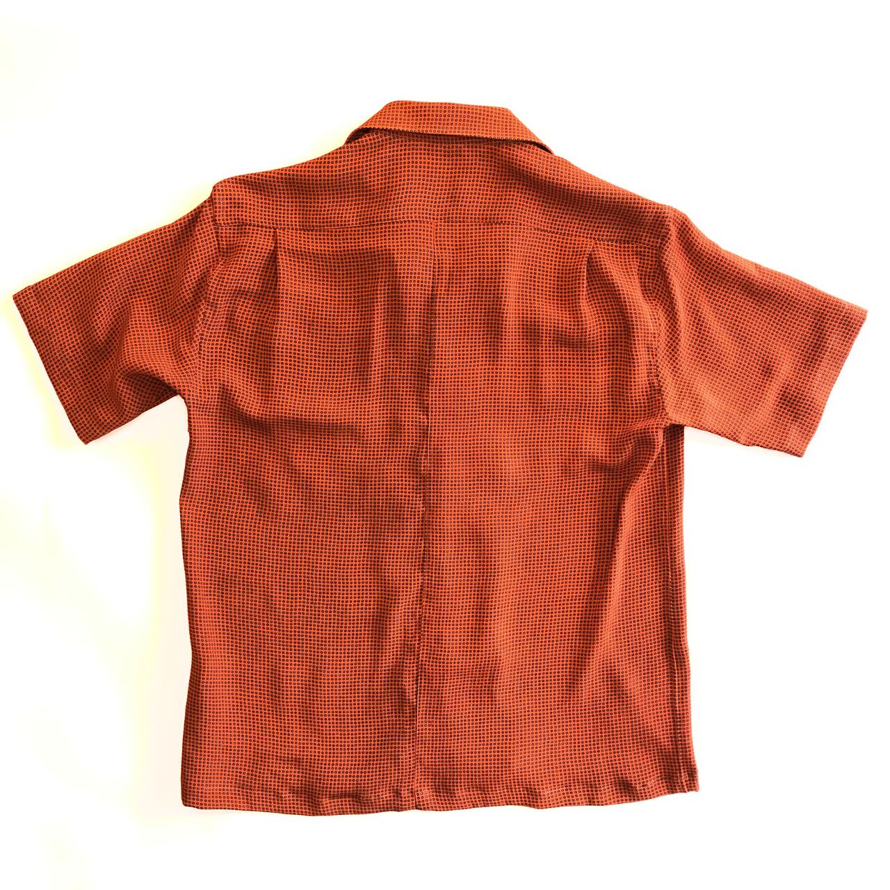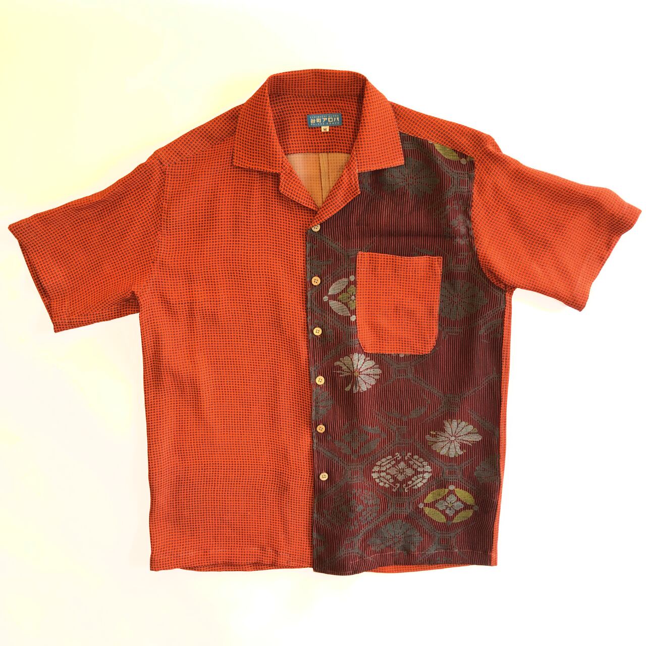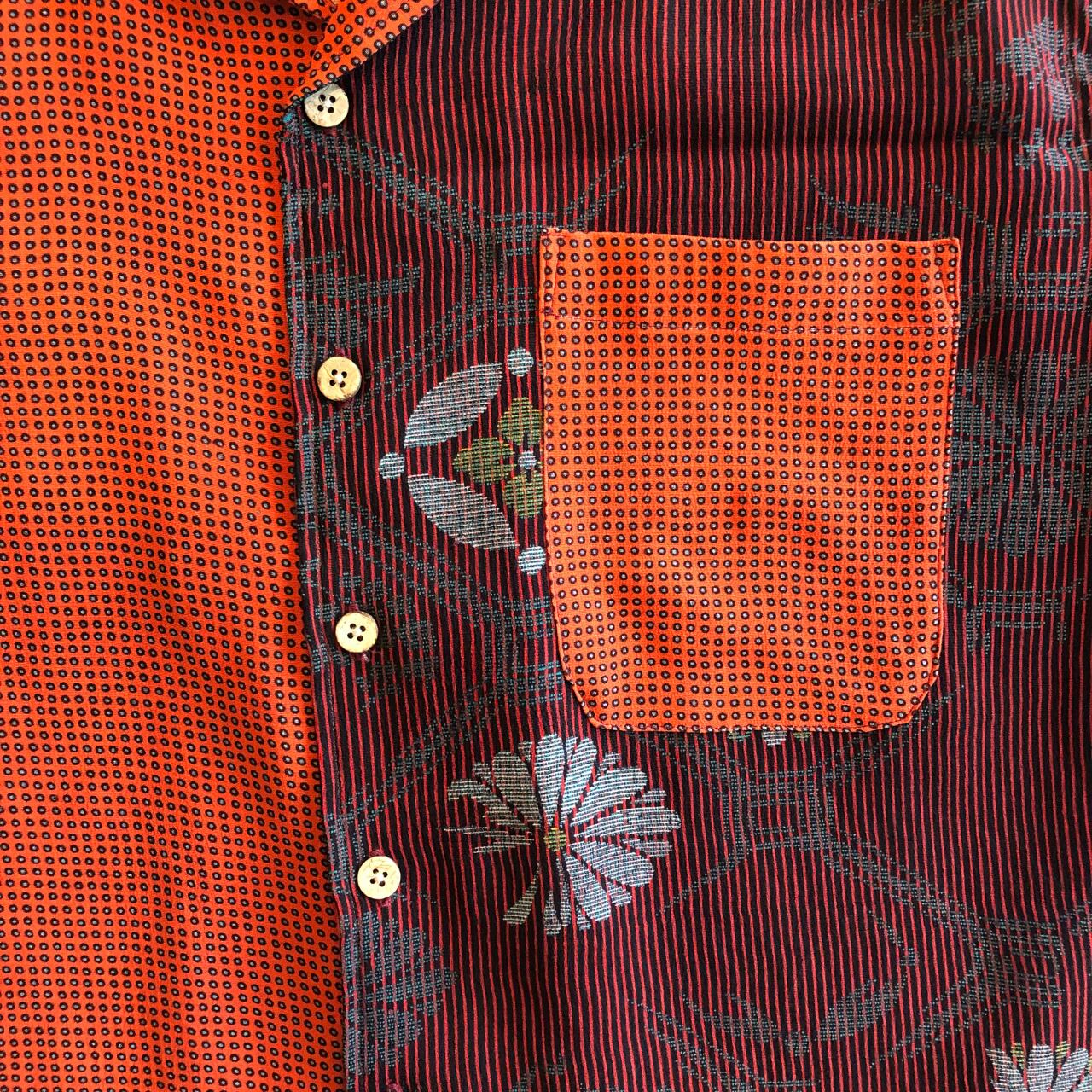 朱色と黒の水玉縞々正絹アロハシャツ【M】