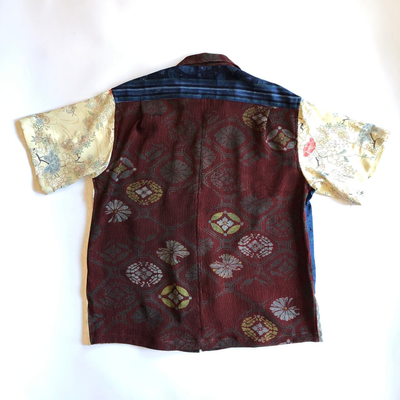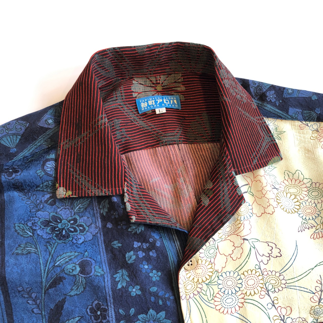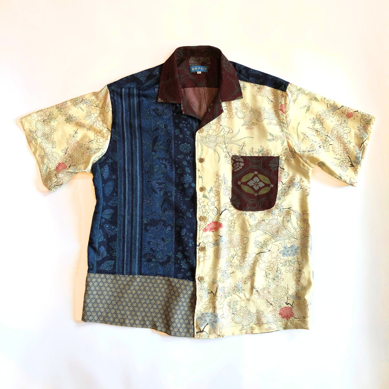 アイボリーとブルーの正絹ミックスアロハシャツ【L】
