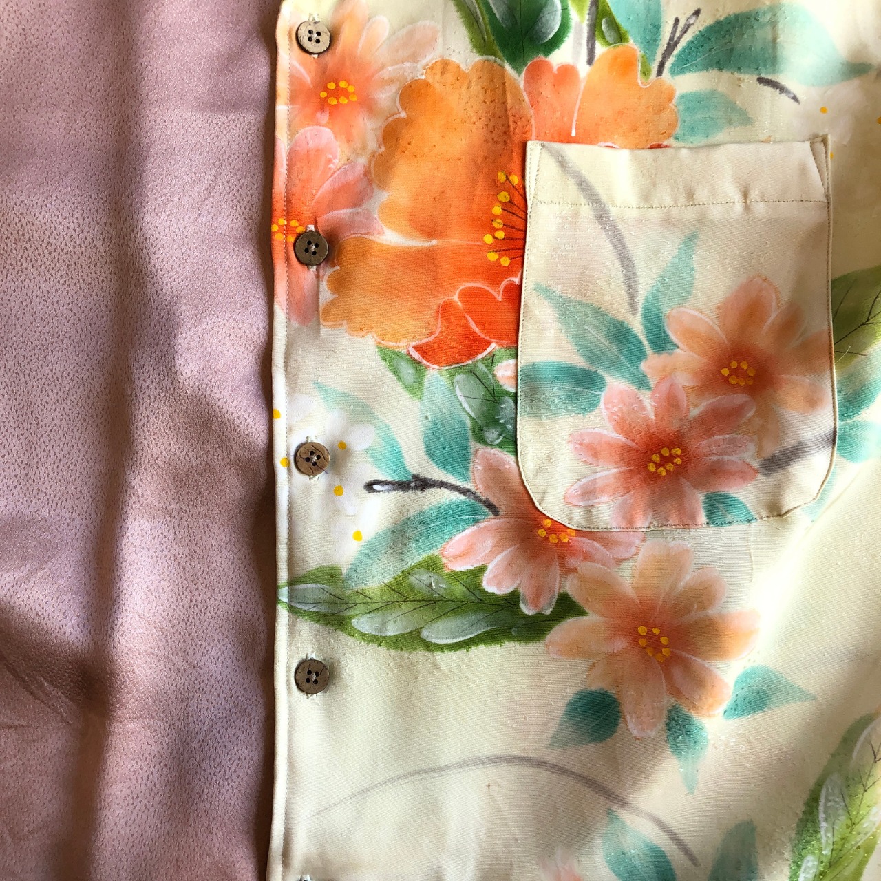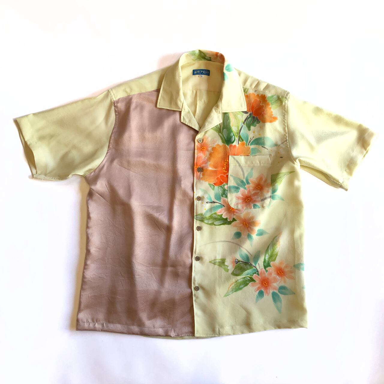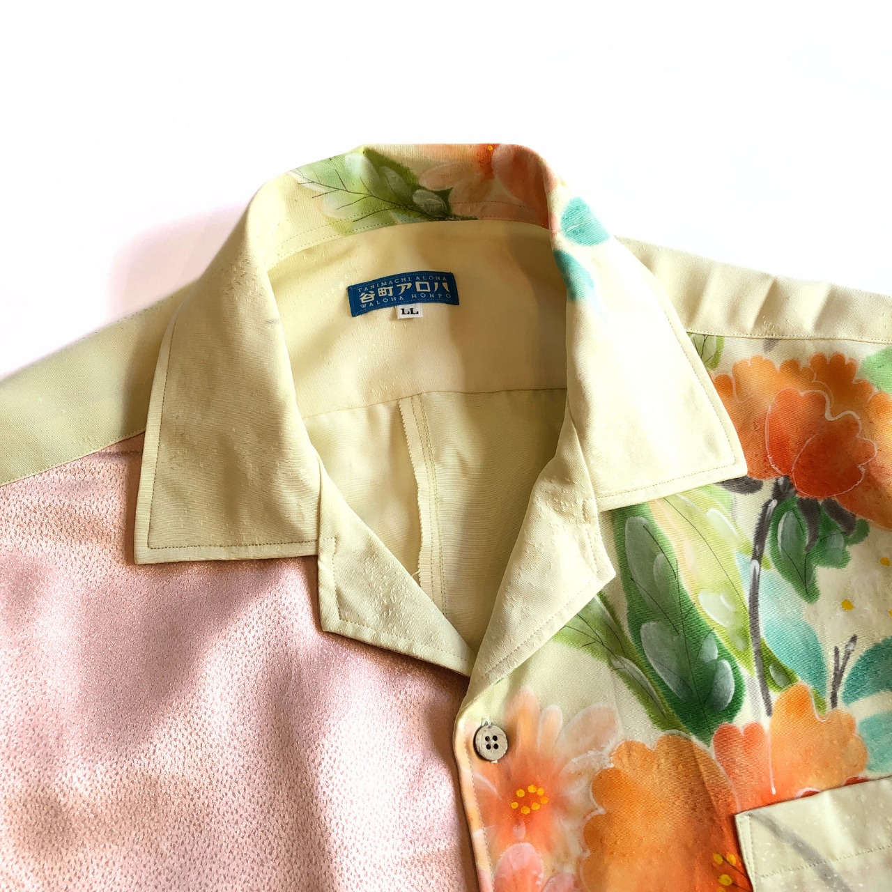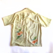 クリーム色にオレンジの花とピンクの綸子の正絹アロハシャツ【LL】