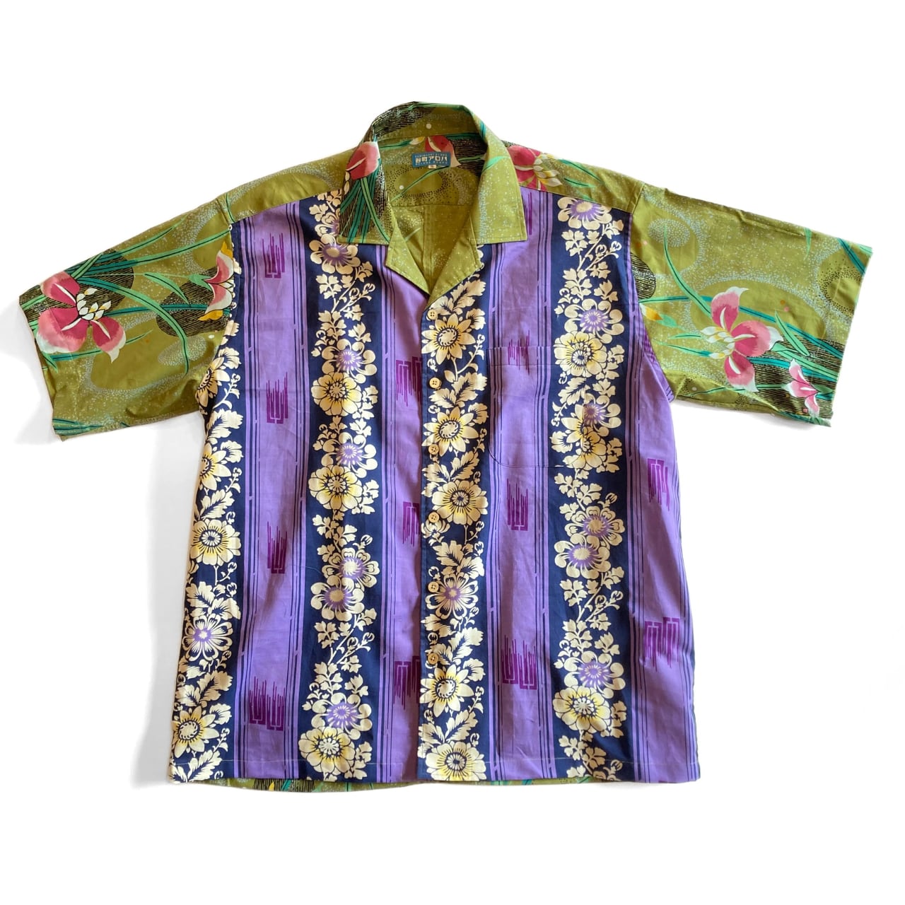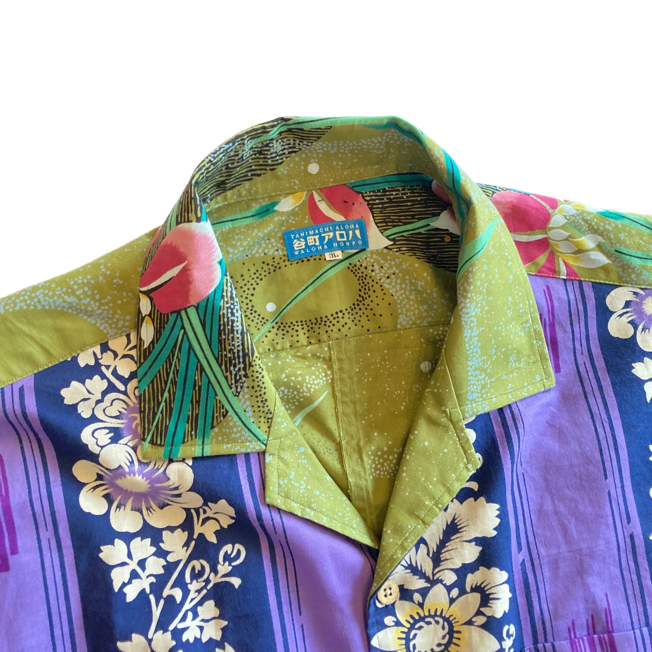 紺色と紫の縦縞と抹茶色の浴衣地アロハシャツ【3L】